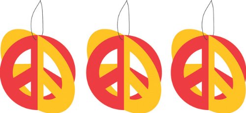 A fun way to help decorate for your Tie Dye Fun themed party, or other groovy occasion. Our hanging cutouts measure 7 inches wide, and feature an intersecting red and yellow peace sign design suspended ornament-style from an included white string. 6 cutouts per pack.