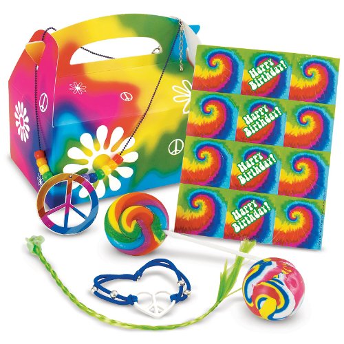 Each favor box includes a Tye Dye Fun sticker sheet, one nylon hair extension asst. (our choice please), 7" heart-shaped peace bracelet, an 18" rainbow peace sign necklace, a psychedelic bounce ball, and a Rainbow Swirl Pop. Adult assembly required. * Please Note: One or more of the party favors included in this favor kit may be substituted with an item of similar quality due to availability.