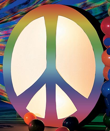 Our newly improved peace sign is illuminated to bring a bright retro look to your big night! Our peace sign is tie dye in color and is printed on clear corex with purple sides. The peace sign measures 68" round x 12" deep and is self standing. Included are 2 light fixtures - light bulbs not included (40 watt bulbs recommended). Easy assembly.