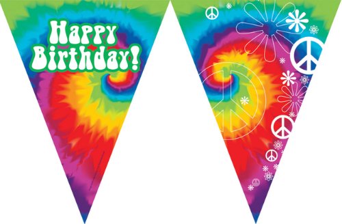 Plastic flag banner matching the Tie Dye Fun birthday party theme is 12 feet long, approximately 10 inches tall, and reads "Happy Birthday" on every other flag.