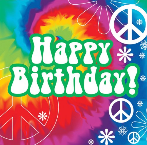 Tie Dye Luncheon Napkins feature a vibrant colored retro design with flowers and peace symbols with the phrase "Happy Birthday" printed on the center of the napkin. These decorative luncheon napkins are constructed from standard 2ply tissue.